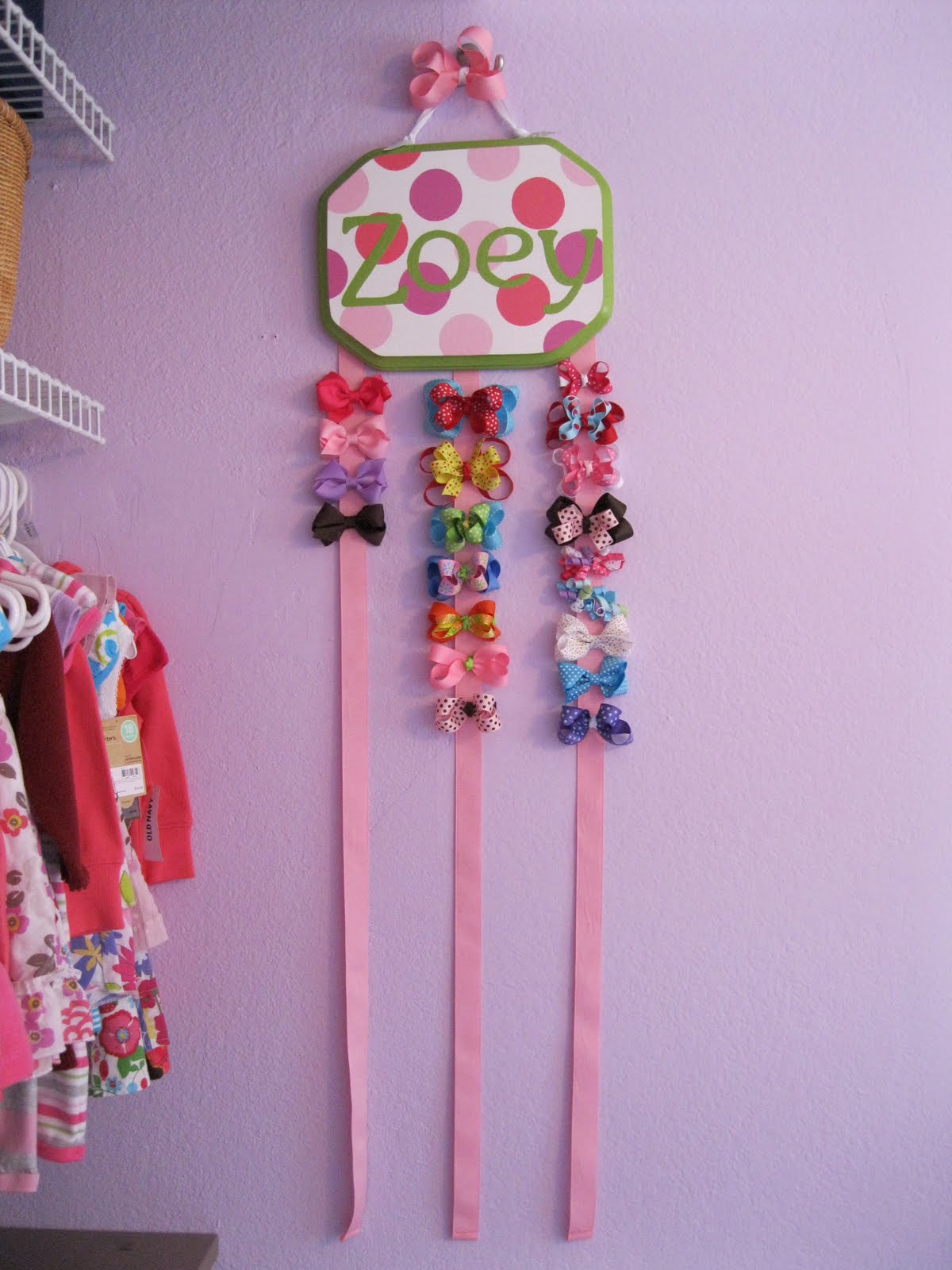 Ever since I had a girl I was like "she is going to wear a bow with every outfit". Then I saw the price of the bows...bummer!! Then one night I was like "I bet I can make my own bows". And after a few tries I made my very first bow!!!! Now I am addicted and have made over 20+ bows. Then I needed a place to clip the bows and that is when I came up with my bow holder that hangs on the wall. So here is a sneak peak at some of my bows and hopefully within a month I can get these bad boys up for sale...SO, if anyone is intersted, let me know :)
